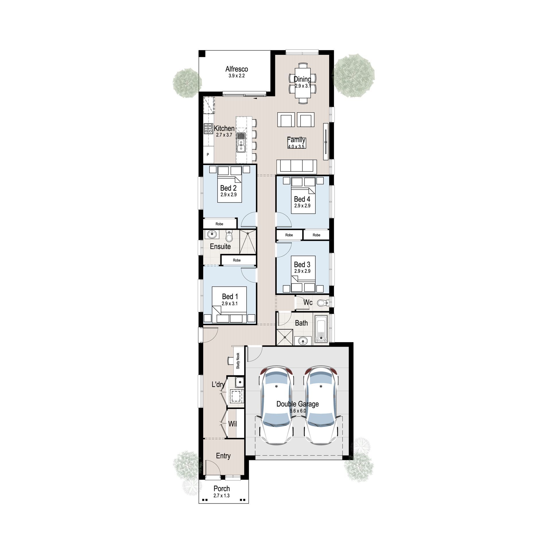 Cape 19 features a larger home designed into a compact single storey, suited well to a narrow block. Greeted by a long entry hallway, this home is an entertainer’s delight with a formal living room or home theatre towards the front and an open plan style kitchen dining area at the rear, leading onto the generous alfresco.
