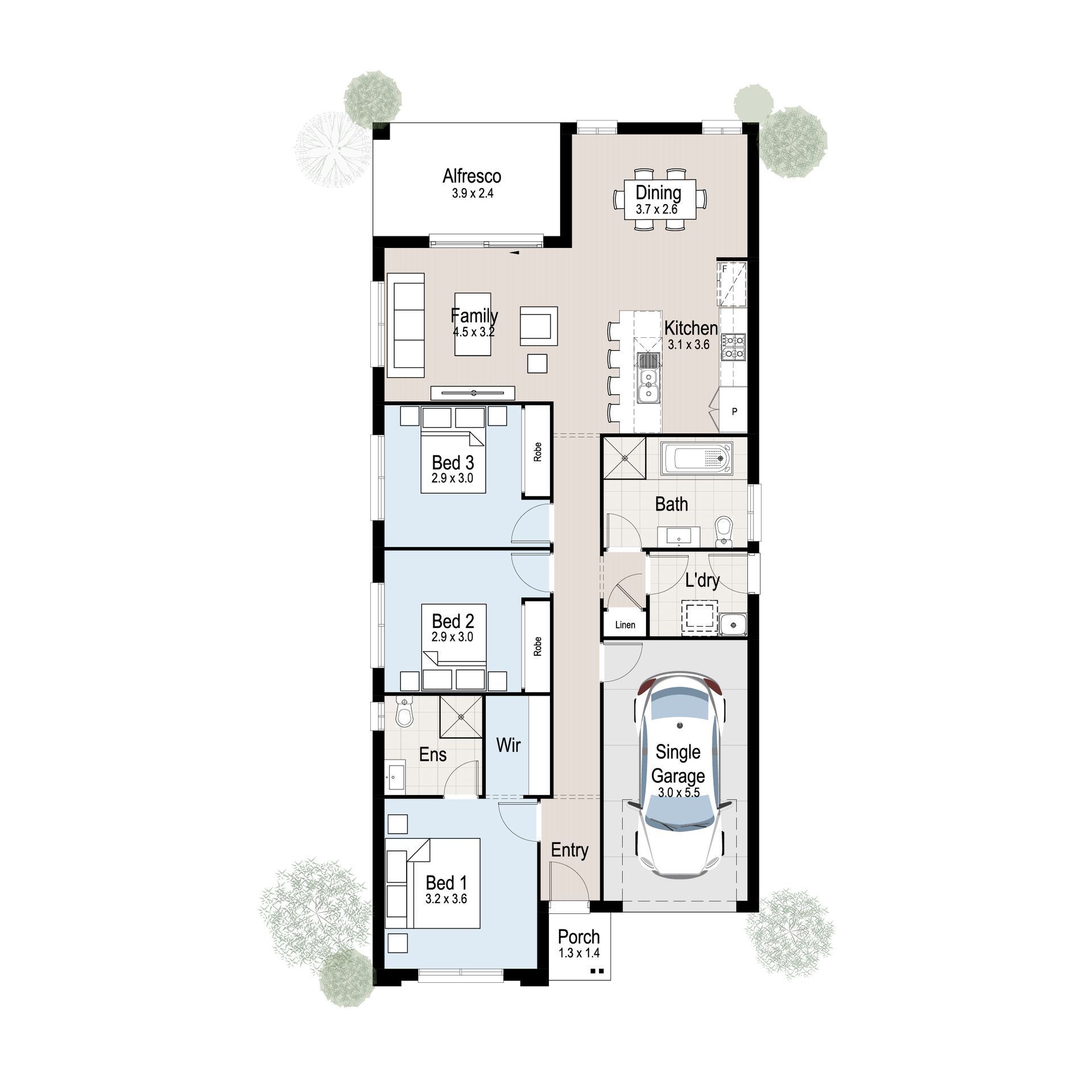 Habitat 15 has been designed with a variety of lifestyles in mind, from the young family to downsizing retirees. Ideal for smaller blocks, this clever floor plan delivers all the essential luxuries into one efficient home. With a generous living area sheltered to the rear of the home, this design offers a sense of spaciousness that continues through to the oversized alfresco.