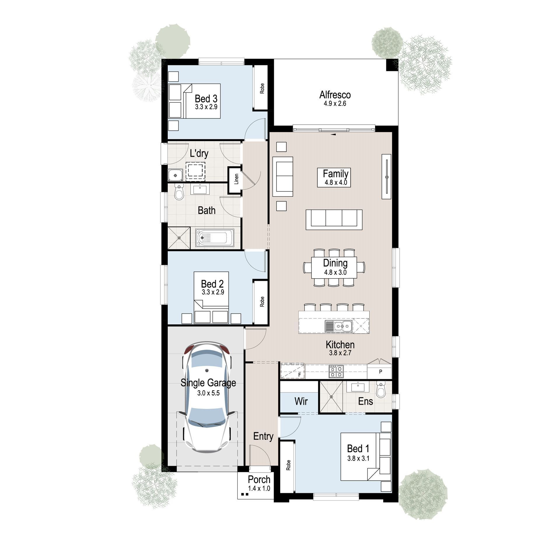 Habitat 17 has been designed with a variety of lifestyles in mind, from the young family to downsizing retirees. Ideal for smaller blocks, this clever floor plan delivers all the essential luxuries into one efficient home. With a generous living area sheltered to the rear of the home, this design offers a sense of spaciousness that continues through to the oversized alfresco.